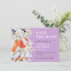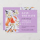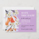 Elegant och chic spara datum meddelande-kort med vackert blåsande tangerin grenar. Blommigt botaniskt kort med vår delikat blomma och citrusfrukter. Orange, pastel och lilac färg. Anpassa med texten.