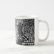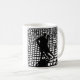 Keramisk mugg för vit som presenterar konsten av Jon Ott och att visa en man och en kvinna, silhouetted som dansar tangoen på en kullerstenväg. Den original- konsten gjordes genom att använda linocut som printmaking.