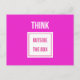 Roligt och klok slogan på vykort. "Tänka" i vitt, utanför lådan, där orden står "utanför lådan" vid djup rosa. Inspira dig själv eller motivera en vän; var kreativ och nyskapande medan du lever ditt bästa liv.