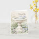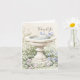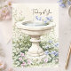 "Thinking of You" kort med en akvarellillustration av en fågelbad omgiven av en trädgård med blå och rosa blommor och lövverk som växer runt fågelbadet. Lövverket är avbildat i olika nyanser av grönt. En neutral beige akvarellbakgrund och dämpade pastellfärger bidrar till en lugn och försiktig estetik. Frasen "Thinking of You" i en flytande, handskriven stilskrift uppe till höger på bilden. En lugn illustration kompletterad av ett varmt och sentimentalt budskap. Den neutrala akvarellbakgrunden upprepas på insidan till vänster. Den anpassade hälsningen "Sending happy thoughts your way today" visas på insidan till höger och fågelbadsillustrationen upprepas i nedre vänstra hörnet med ut