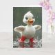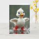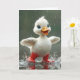 En glad vit ankunge som bär röda regnstövlar skvätter glatt i pölar.