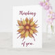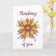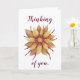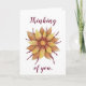 "Tänker på dig" gratulationskort med en gyllene solros och ett skrivet meddelande runt illustrationen. Perfekt för att hälsa en vän eller skicka ett kondoleansmeddelande. Tomt på insidan.