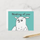 Detta vykort har en söt uggla som säger "Tänker på dig" mot en blågrön bakgrund. Jag tecknade den här lilla ugglan med penna. Se min butik för fler ugglegåvor.