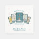 This tarot themed baby girl shower napkin features a five-card spread with hand-drawn illustrations of The Sun, The Star, The Baby, The Moon, and The Chariot, each reimagined with sweet baby motifs like a rattle, bottle, and carriage. The message reads “The future is clear... the baby will soon be here,” with space below to personalize the event name and date. Light pink twinkles and star accents in the background add a magical touch to your table setting. A perfect match for celestial baby shower invitations, magical baby shower aesthetic, tarot inspired showers, and Halloween baby shower ideas. Designed to coordinate with other items in the tarot baby shower collection.