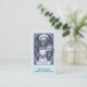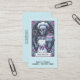 A unique Tarot themed baker, pastry chef business card featuring a skeleton with cake and whisk. A unique style with skeleton baker in chef's hat. Blue and pink hues.