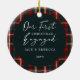 Första julen försåg dig med fotoornament, personlig med foto, namn och året. Utformningen är dubbla och har ramar med pläterad handskrift. Fotografimallen visningar bild som en rund form och den andra sidan är märkt med "vår första julklapp engagerad ... [efternamn och år]". Om du har problem med placeringen kan du prova att beskära bild till en kvadrat innan du överför.