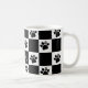 Vågräts svarta och vita markerade bakgrund och svart tass avtryck i vita fyrkanter. Det finns ett litet vitt hjärta i varje avtryck