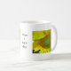 Eine Sonnenblume mit hellgrünem Zentrum ist auf dieser Tasse zu sehen. Sie Trägt die Aufschrift: Ha en trevlig dag.