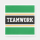 Den här sportetiska, atletiska designen har fet TEAMWORK-text inuti ett markerat svart rand med dubbla vit och gult tävla ränder mot ljus bakgrund av grönt. Texten i den här designen kan vara personlig.