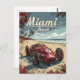 En vintage som är kapslande och som innehåller Miami Beach i dess nostalgiska gloria, försedd med klassiska handflatan träd och pastellhuvar. I förgrunden kör en bil i tävlan av snyggt i vintage längs kusten, vilket utesluter en tidlös elegans och en känsla av äventyr från en förlegad era. Konsten fångar perfekt den glamor och upphetsning som Miami Beach har under sina gyllene dagar.