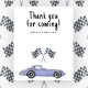 Kort för inbjudan till babydusch för biltemat i tävling med vattenfärgade illustrationer av lila (violett) vintage bil och svart - vitt tävling flagga. "Tävling på för en babydusch."