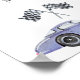 Kort för inbjudan till babydusch för biltemat i tävling med vattenfärgade illustrationer av lila (violett) vintage bil och svart - vitt tävling flagga. "Tävling på för en babydusch."