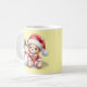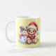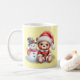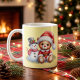 Taza navideña de cerámica con un dulce diseño de osito con gorro de Papá Noel acompañado de un simpático muñeco de nieve. Su fondo en tono suave resalta la ilustración, creando un estilo tierno y acogedor. Ideal para disfrutar bebidas calientes en invierno o como regalo especial en estas fiestas.