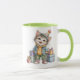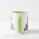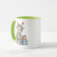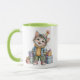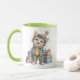 Taza de cerámica con interior y asa en color verde, decorada con un adorable gatito estilo ilustración infantil, vestido con ropa de invierno y rodeado de pequeños regalos.