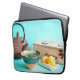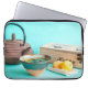 Teauppsättningen för en person med gjutjärntekannan, den handgjorda leratekoppen, tea boxas och två ostscones.