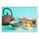 Tea-uppsättning för en person med tekanna från järn, handgjord lerkock tekopp, tebox och två ostkoner.