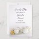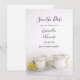 Söt Tea Kopp med Gult Daisys Bröllop spara datum annons Card anger tonen för ceremonin och mottagningen i giftermål. Den här anpassningsbarna blommar en elegant under den kritiska behållan med datumangivelsen en blommigt bild av ett te kopp, en sås och en kräm med små daisy av gult och vit satin. Perfekt till paret som planerar ett tebröllop i party eller på högtebröllop.
