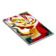 med original konstdesign från akvarellmålning av Sacha Grossel av röd och gul hybridterosblomma mot grön bakgrund. Denna ljusa och moderna konstdesign är av en stor, närfokuserad makroblommig design av ett botaniskt motiv i ljust, levande, färgglatt stil för blomster- och rosenälskare överallt.