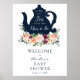 Välkommen gäster till din babyfest med denna vackra affisch, med en marinblå tekanna med "Te för tid med den blivande bruden" i rolig handskrift. Med burgunder, rosafärgade, orange och korallfärgade blommor. Lägg till hedersgästens namn, datum för babyfesten och anpassad välkomsttext med hjälp av de fält som tillhandahålls.