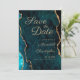Eleganten sparar datumkortet med teal aqua marble-agate med fotot från guld glitter bröllop. Ett foto på baksidan.