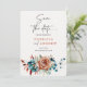 Blommigt för elegant och bränd Orange Spara datumkortet | Den mallen Ro & Teal Bröllop Skapar ett bestående intryck med blommigten elegant Spara datumkortet med en sofistikerad blandning av Teal och Burnt Orange accents. Perfekt för modernt bröllop. Den här anpassadet ger en unik beröring med känslig typografi och en romantisk blommigt arrangemang. Idealisk för par tittar en mjuk utformning och en snyggt för att tillkännage sin speciella dag. Anpassa det till ditt bröllop-tema. Högkvalitativ utskrift på överlägsen papper ger en lyxig känsla.