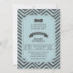 Den här babyutbjudningen innehåller en teal/blue och grått/grått Chevron-bakgrund med en bockslips och ett blått ram med duschdetaljer i modern form.