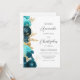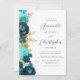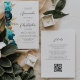 Den lämnat kant i denna elegant, den moderna bröllopsinbjudan, har en tealblått och akvatisk blommigt gräns som trimmas med fotfolie från guld. Anpassadet kombinerar grått-skriptet för kol och sans serif typsnitt på vit bakgrund. På baksidan finns utrymme för information om bröllop, tillsammans med en QR-kodgäst som kan söka på webbplatsen och OSAN, vilket sparar kostnaderna för utskrift och utskick av separat OSA kort.