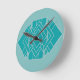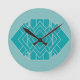 Den här klockan har en konsdeco quilt-inspirerad design av diamantformer och en rektangel, både i rial och silver, på en fält av lättare teal.