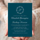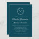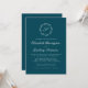 Den här inbjudan från elegant bröllop har en vit skript med monogram som inledningsvis omges av en botanisk andedräkt på en tealblå bakgrund. Namn visas i vitt skript, med resten av texten i klassiskt serif-teckensnitt. Kortets baksida är en solid teal.