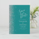 Det moderna bröllop spara datum-kortet från elegantens lämnat kant har ett silver faux glitter gräns. Anpassadet kombinerar handskrift, tryckplåt och kursivt typsnitt med handskrift av silver grått på en helblå bakgrund. Den omvända sidan har en passande teal och silver-design.