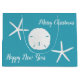 Tropiskt blått pappert julklapp i stor storlek. Vita stjärnor/havsstjärnor och sanddollar dekorerar båda sidor. Anpassa hälsning i två ställe på framsidan. Exempelformuleringen är "God jul" och "Gott nytt år".