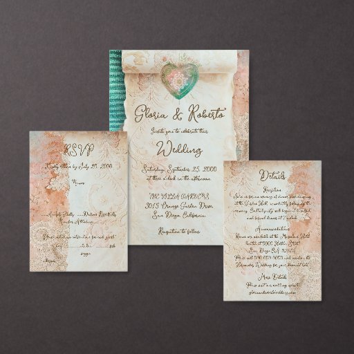 Teal Blush Lace Heart Baroque Wedding Romance presents a refined visual narrative rooted in Old World elegance and romantic symbolism. A layered palette of muted teal, sea-glass green, blush rose, soft coral, and antique ivory creates a serene yet expressive foundation. At the center, a sculptural heart motif appears luminous and dimensional, surrounded by intricate lace detailing and softened ornamental scrollwork reminiscent of Baroque and Rococo craftsmanship.