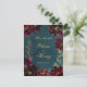 En tealblå juvelton bröllopsinbjudan i förhandsversion med en symfoni av djupa bordeaux hallonröda peonior prydda med guldspray och skimrande guldkanter samlade runt en djup tealblå akvarellbakgrund med era namn i guld rustik skrift och en liten versal sans-serif-teckensnitt som tillkännager era detaljer.