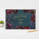 En röd, grönt och blå juvelton bröllop som ber gästerna att skriva på gästen bok. Den har en vattenfärgad bakgrund som tvättar tealblått grönt med burgundy och safierblåa peonier med högdagrar för halloners rosa i en symfoni med djupa juveltoner.