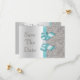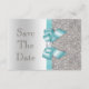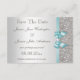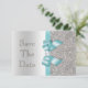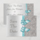Personliga bröllopsinbjudningar "Save The Date". Eleganta skräddarsydda silver- och tealfärgade dubbelsidiga platta "save the date"-kort med ett vackert glittrigt tryckt glittermönster, söta blanka tryckta turkosfärgade/tealblå vektorbilder av slingor och band och snygga, stilrena tryckta bilder med diamant-bling-juveler och mörkgrå silvertext på en silverfärgad gradientbakgrund. Dessa klassiska, glamourösa och moderna silverfärgade formella anteckningskort är dekorerade på båda sidor och tryckta på ditt val av inbjudanpapper. Vackra, snygga, moderna och dubbelsidiga kort med kvinnlig glans och glamour. Observera: Alla inbjudningar på Zazzle har platt tryckta bilder. Jag har matchande produkter för bröllop i min butik. Text, teckensnitt och färg på