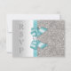 Personliga formella RSVP-platta kort / inbjudningar för alla evenemang - bröllop, baby shower, födelsedagsfest, sweet 16, Quinceanera-firande, förlovningar, brud shower osv. Eleganta anpassade silver- och teal / turkosblå dubbelsidiga svars kort med ett vackert glänsande tryckt glitter, rhinstenar, paljetter mönster, söta glänsande tryckta vektorpilar och band och vackra, stilrena tryckta bild diamanter bling juveler och mörkgrå text. Dessa klassiska glamourösa, fashionabla silver- och teal-rsvp är dekorerade på båda sidor. Vackra, chic, trendiga, moderna dubbelsidiga kort med glitter och glamour. Observera: Alla inbjudningar på Zazzle har platta tryckta bilder. Jag har matchande produkter i min butik. Text, teckensnitt och färger på teckensnitt är