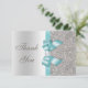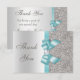 Personligens formella Tack-kort för platta anteckningar för alla evenemang - bröllop, babyduschar, födelsedagsfest, söt 16, Quinceanera firande, förlovningar, möhippa osv. Elegant anpassningsbar silver och teal/turkoblått färg dubbla sida vid sida tack vare ett vackert glätttryckt glitter, rinestoner, sekviner mönster, söta glandiga vektorbågar och rosett band och söt, snyggt tryckt bilddiamanter på vitlingjuveler och mörk grått text. Dessa glamorösa, moderiktiga kort från silver och färg dekoreras på båda sidor. Vackra, chic, trendig, moderna dubblor sipprade kort med gllitz och glamor. Observera: All inbjudan på Zazzle har platt tryckt bilder. Jag har matchande produkter i min butik. Text, teckensnitt och färg i teckensnitt kan anpassas efter dina behov. Om du behöver hjälp med att anpassa produkten kontaktar du mig genom min butik. Jag kommer att vara lycklig för att hjälpa till.OBS! - Alla inbjudningar till Zazzle har platt tryckt bilder.