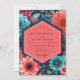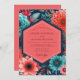 Lush botanical elements in vibrant teal and coral hues create a striking visual. The deep, dramatic background accentuates the bold floral blooms, evoking a sense of dramatic elegance. This design captures a rich, enchanting atmosphere perfect for a memorable occasion.