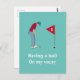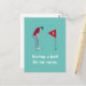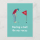 Golfer, med en hatt, djup röd skjorta och blå byxor, som lägger ett golf boll i en hål-stensdesign. Lägg till din egen text till det här vykortet för grönten.