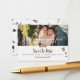 En elegant blommigt Spara datumkortet med teal grönt och beige ro. Ladda enkelt upp bild eller överför vintage bröllop-designen till ett annat kort. Vackra trädgårdskonst i ro är mångsidig för färg i burgundi och grönt av skogen. En match för elfenben, dammig rosa, dammig persika, botaniska Vår bröllop teman.