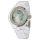 Women's Personalized Teal & Gold Marble Rhinestone Watch – White Enamel Strap – Custom Gift for Bride, Wife, Mom – Elegant Anniversary & Birthday Present.