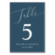 Minimal och elegant bröllop-bordsnummer med modern skripttext som säger "Bord" överst på tealbakgrunden.