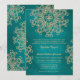 En vacker teal påfågel blågrön turkos JUWELTONAD och guld bröllopsinbjudan med ett exotiskt indiskt inspirerat ornamentalt sari MEDALLONG mönster MED EN BLOMSTER- OCH LOTUSSOLSTRÅLNINGSDESIGN. Denna eleganta och vackra lyxiga moderna indiska stilen bröllopsinbjudan är perfekt för alla formella tillfällen MED EN ÖSTASIATISK INDONESISK MAROCKANSK ALADDIN ELLER TUSEN OCH EN NATTS TEMA. Designad av Chrissy H. Studios, LLC. Alla rättigheter förbehållna.