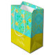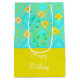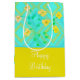 Grattis på födelsedagen presentsäck, medium storlek med blommigt och mönstrad bakgrund, färg är citronkalk och teal. Anpassa texten till kostym vid särskilda tillfällen.