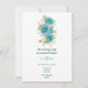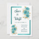Det här vackra Spara datumkortet har en bukett av teal och turkos ro med guld löv på en klassisk vit bakgrund.