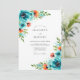 This design features a vibrant watercolor palette of teal blue and fiery orange. Large hand-painted roses in turquoise tones are accented by delicate coral anemones and lush green foliage. The artistic style creates a fresh and spirited mood for any warm-weather event. These botanical clusters provide a striking contrast against the clean white aesthetic.