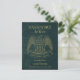 De här sparar datumkort är ett roligt sätt att informera dina vänner och familj om ditt kommande destinationsbröllop. Designade för att likna ett pass har de en teal- eller turkosfingerad läderbakgrund med guld örn på framsidan med bröllop parets namn, datum och plats för nuptialerna. Baksidan liknar insidan av ett pass med ett foto och söt införselhamn i frimärke.