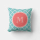 Teal Quatrefoil Mönster, Coral Monogram Kudde