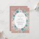 Ömtåliga teal- och rosafärgade blommor flätas samman med mjuk grön lövverk mot en varm rosaguld bakgrund. Denna romantiska design frammanar en känsla av underdriftad elegans och naturlig skönhet för en minnesvärd tillställning.