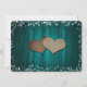 Rustic teal bröllop spara datum-kort med mynningen burk med strängen ljus och med två burlap-hjärtan på en lada med träbakgrund. Anpassa enkelt den romantiska onlinen för rustik teal bröllop spara datum. Matchningsartiklar som är tillgängliga för att komplettera detta teal bröllop spara datum.